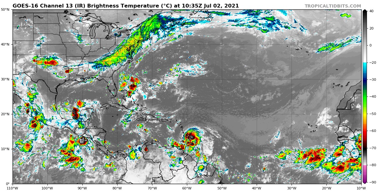 Durante el final de la madrugada, la tormenta tropical Elsa ha continuado aproximándose al Arco de las Antillas Menores, y ha continuado ganando algo más en organización e intensidad, convirtiéndose en un huracán, primero de la actual temporada ciclónica.