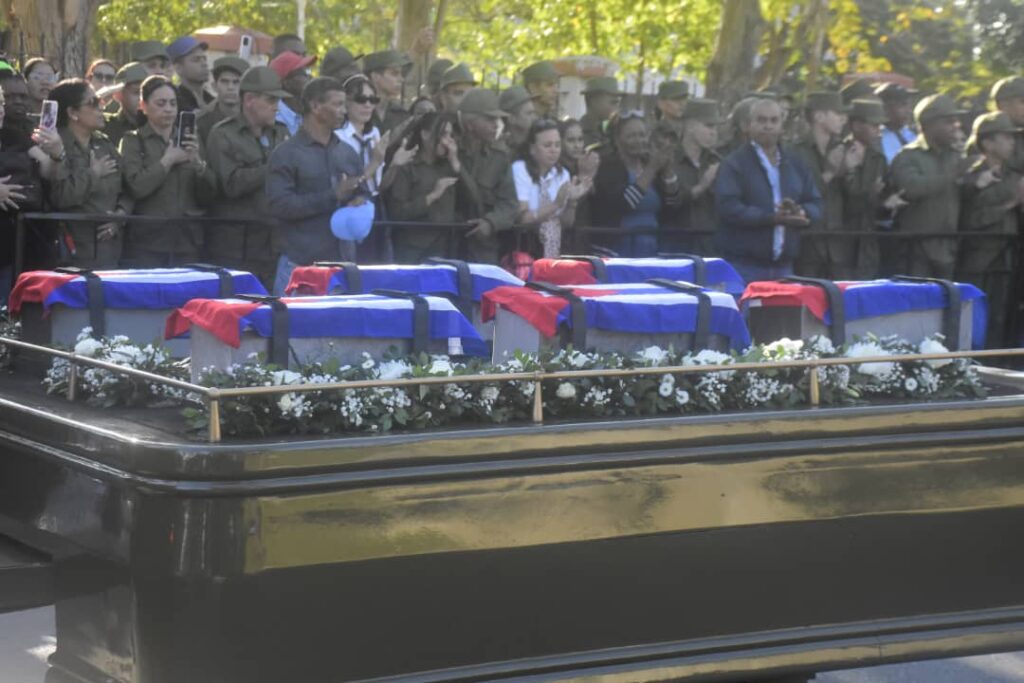 A lo largo de la Avenida Rancho Boyeros hasta la sede de las Fuerzas Armadas Revolucionarias, en el municipio Plaza de la Revolución, el pueblo, conmovido por la barbarie imperialista, manifestó su respeto y admiración por los incólumes combatientes internacionalistas, hermanos que cayeron lejos de sus casas, pero no de su deber.